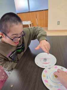 紙皿を使ってコマづくりを行いました。紙皿にはシールを貼ったり...