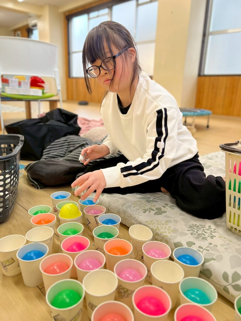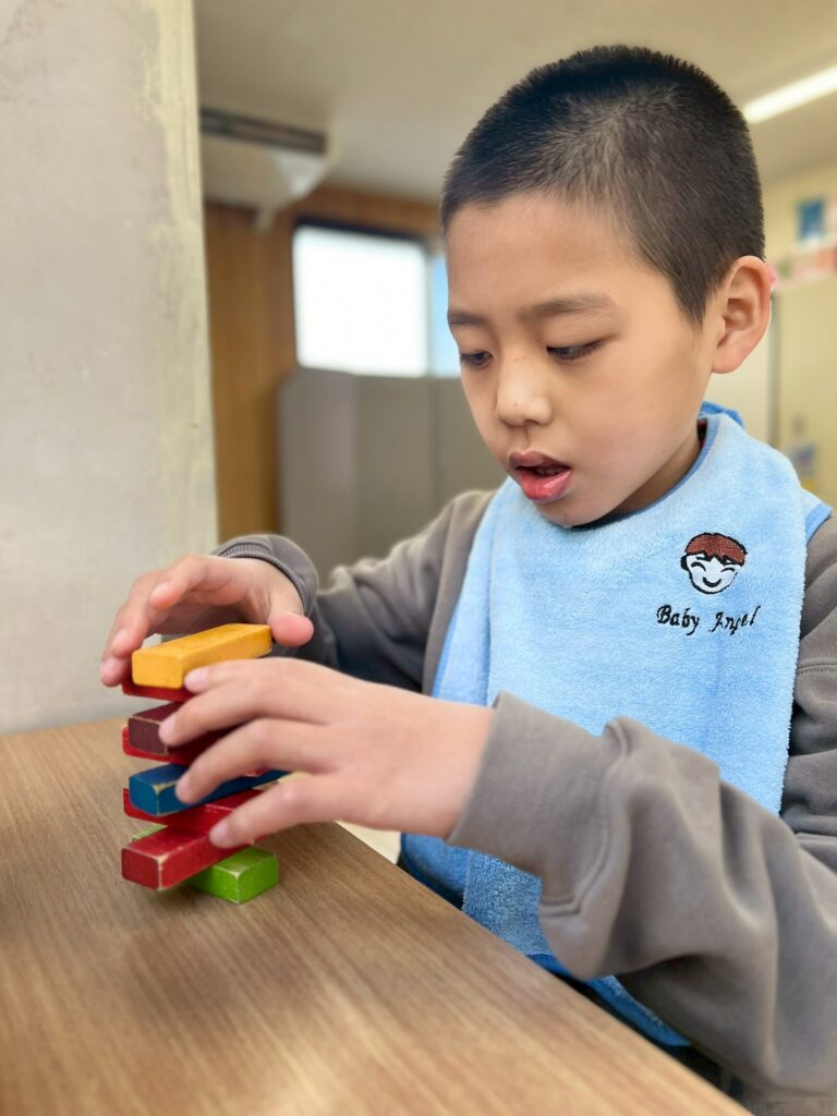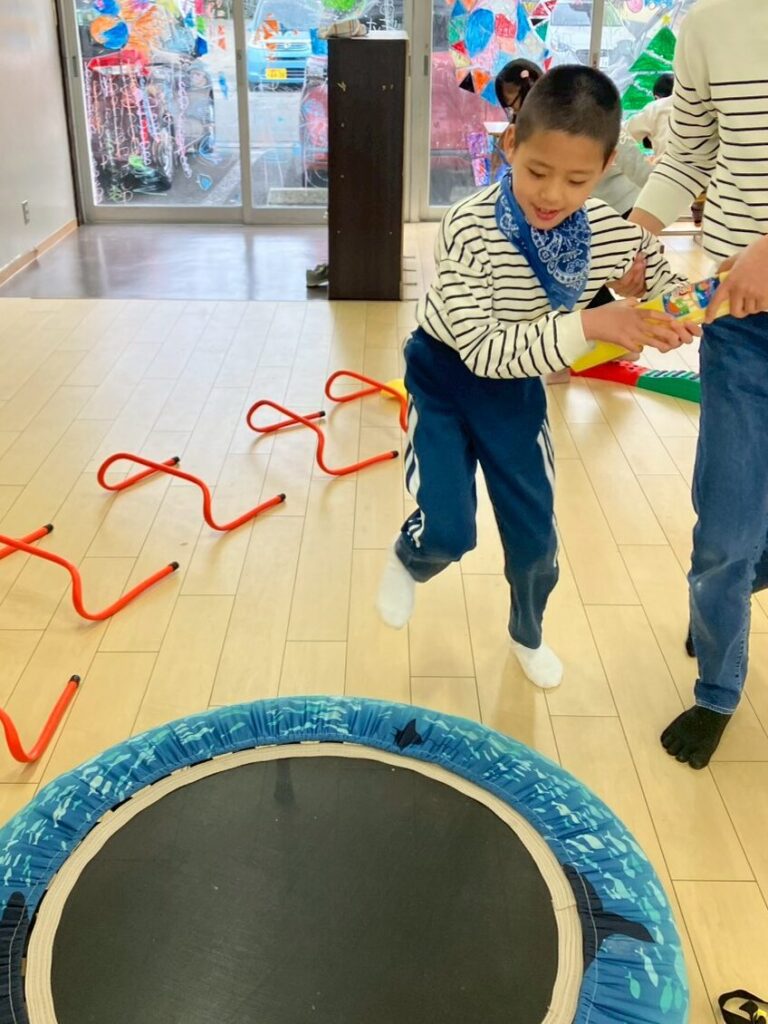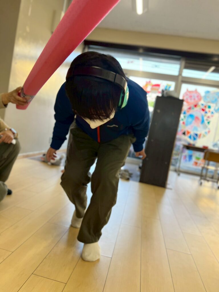 スティックに当たらないようにジャンプしたり、くぐったりと、身体をたくさん動かしながら楽しむ姿が見られました。動いているスティックをよく見て、その場でタイミングよくジャンプしたり、当たらないように素早く逃げてみたりと、さまざまな遊び方を工夫しています。活動中は、あちこちから楽しそうな声や笑顔があふれていました。