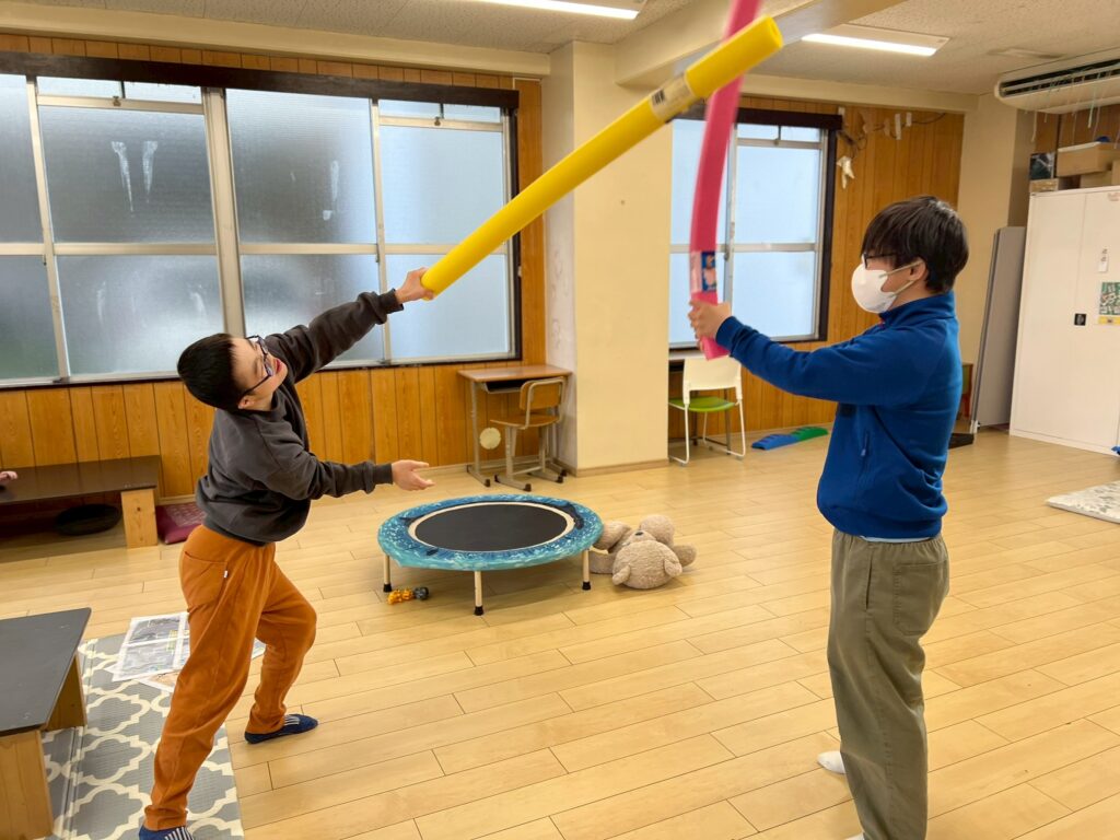 また、プールスティックを剣に見立て、チャンバラごっこのようにして白熱した戦いが繰り広げられる場面もあり、友だち同士での関わりを楽しみながら、元気いっぱい身体を動かしていました。