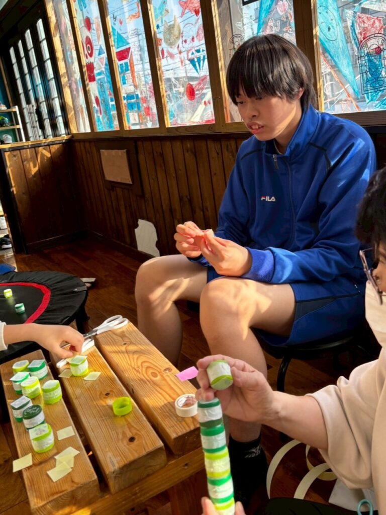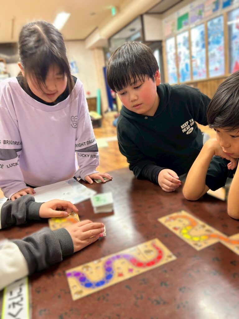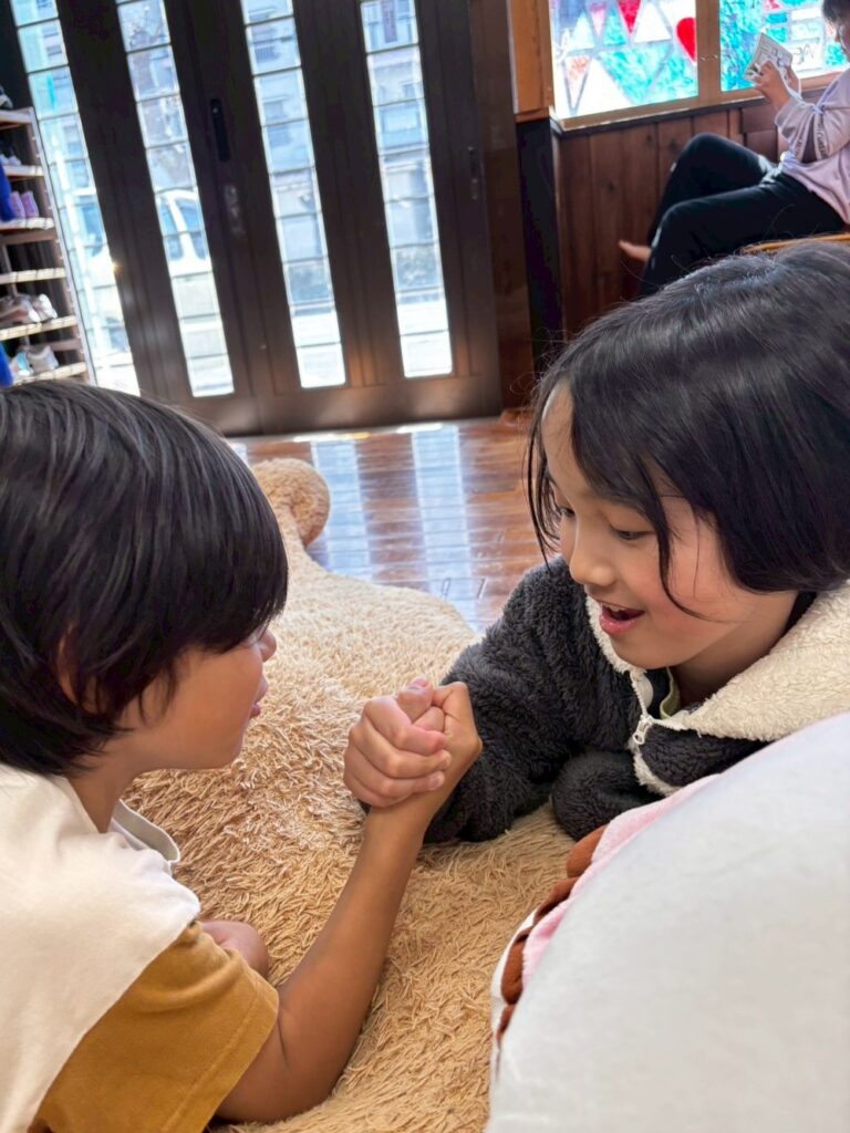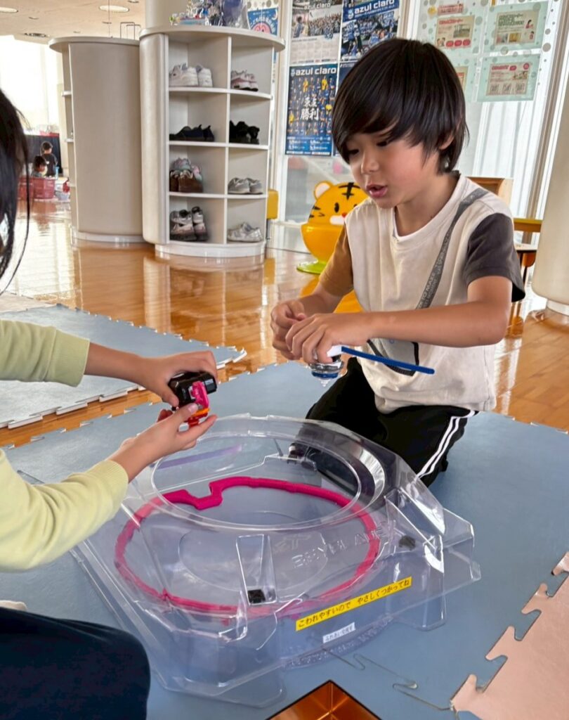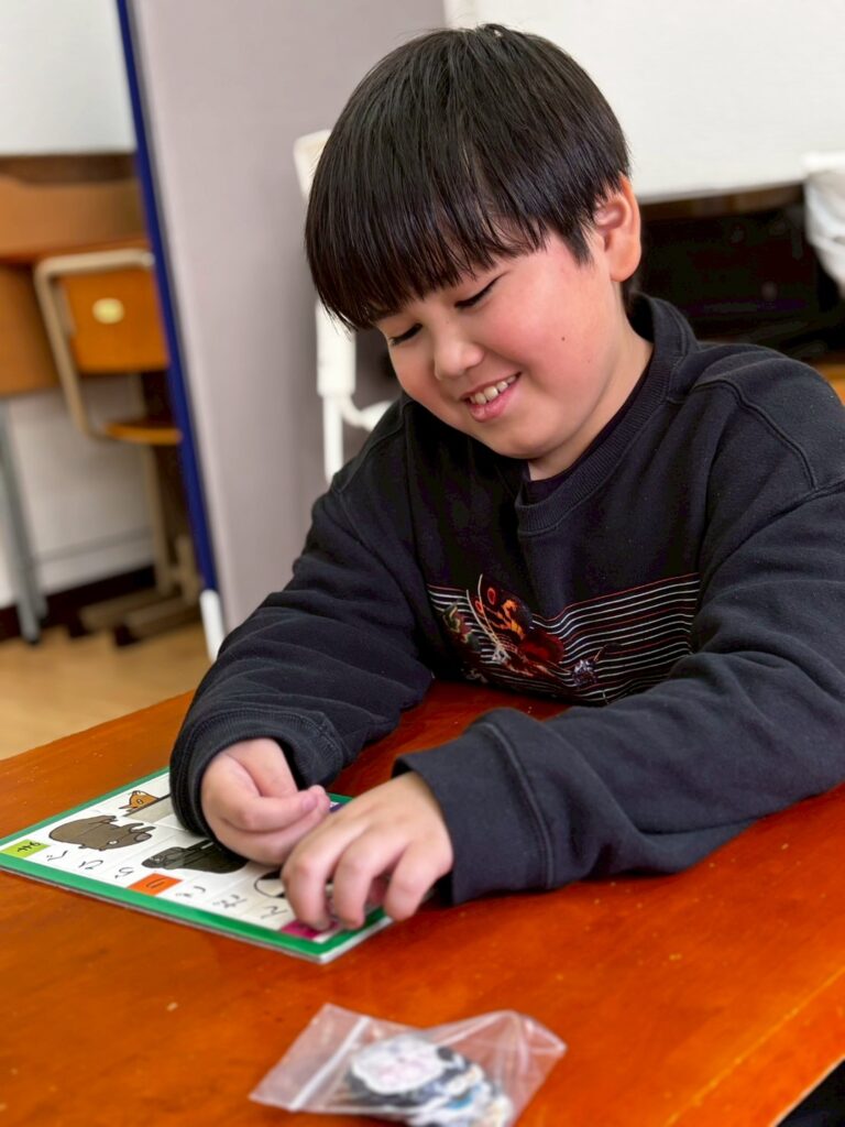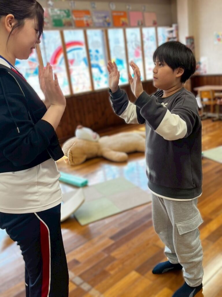 手や指の動きや力加減を養いながら、目で確認する活動となっています。今後もさまざまな玩具に触れながら、手で感じる感覚や動きの刺激を楽しみ、経験を広げていきます。