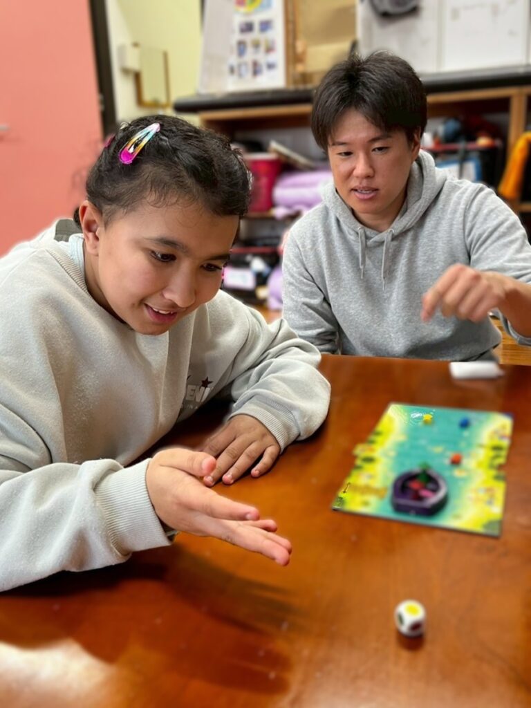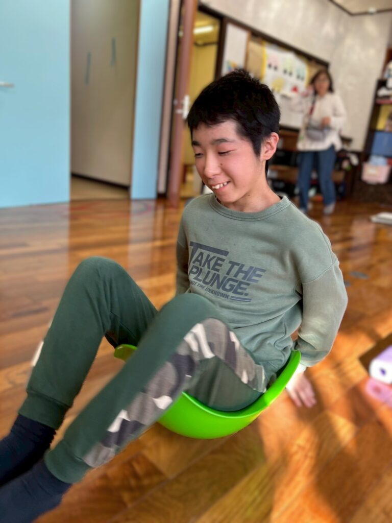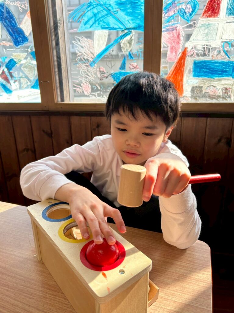 手で押し込む感覚を楽しんだ後、ハンマーを持ち、ボールをしっかり見ながら叩いて落とす動きがわかると、安心した穏やかな表情も見られました。